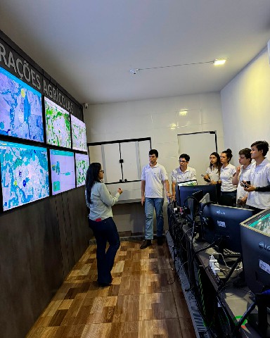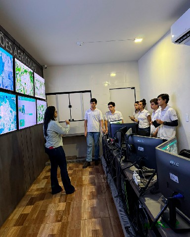 Sob a orientação da coordenadora Maisa e do coordenador geral de operações, Lucas, os estudantes puderam observar de perto o sistema de automação de pivôs e o gerenciamento de frotas utilizadas nos campos da ECR. A demonstração impressionou os visitantes pela eficiência operacional e pelo compromisso da empresa com a inovação tecnológica no campo.